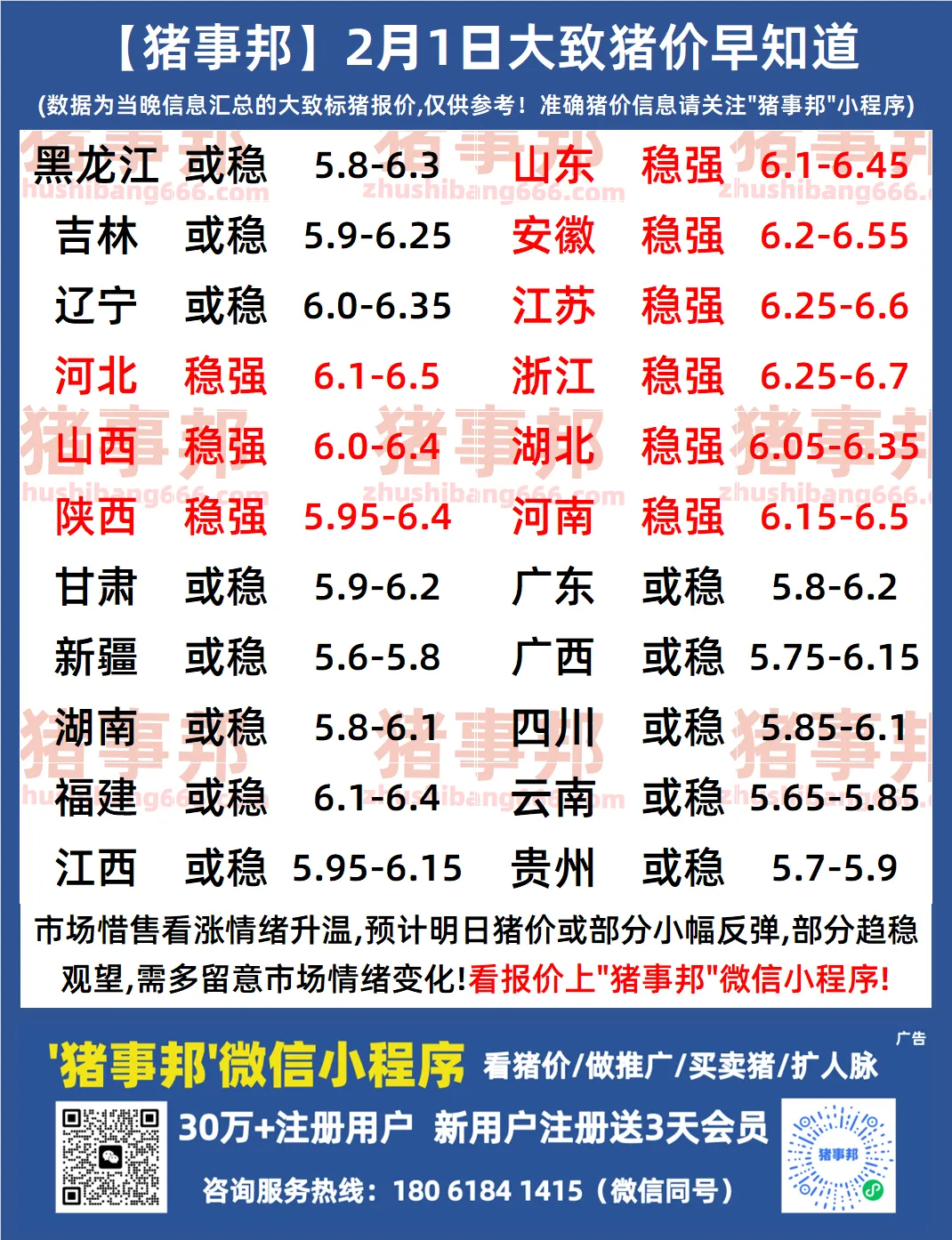 猪事帮|| 2月1日猪价早知道(或小幅“开门红”!)
