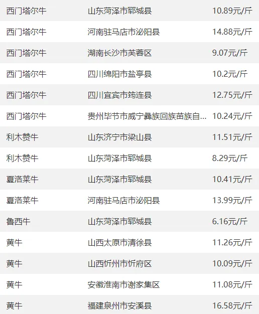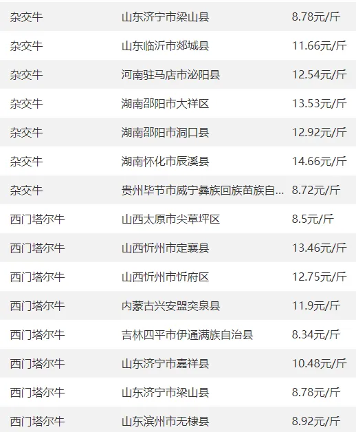 6. 新疆育肥牛价低位补涨0.1元/斤,报13.1-14.1元/斤,仍为全国最低价位区间。