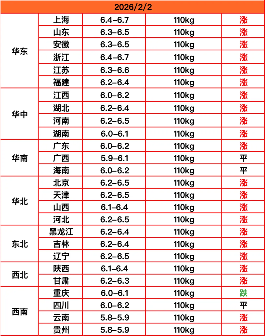 与此同时,随着市场情绪的快速转变,屠宰企业收猪的难度也急剧上升,压价难以持续,只能停止。目前,仅剩重庆一个地区还保持微跌。