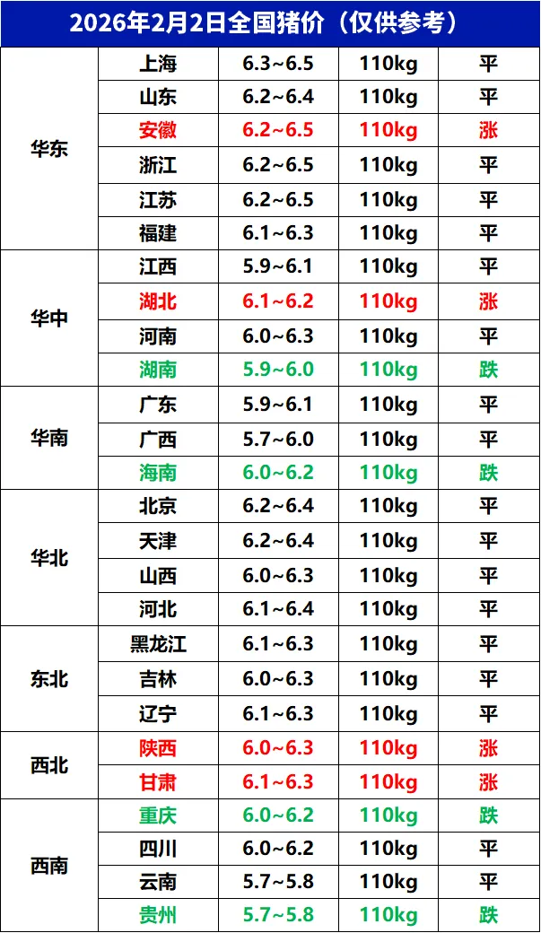2月2日全国猪价 养羊网 2026-02-02 2月2日全国猪价 养羊网 2026-02-02 上一篇:贵州遵义鸡蛋价格:2月2日 下一篇:2026.2.2猪价快讯--福州穗丰动保 您可能还会对下面的文章感兴趣111: 相关文章 2025年4月13日全国各地生猪价格信息 2026年1月31日鸡蛋价格,仅供参考 近期价格更新!!! 马德里三月底的第一天和第二天