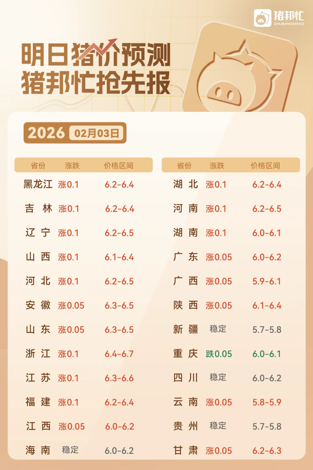 根据2026年2月2日的市场数据,国内生猪市场呈现大面积上涨态势。下面我将为您梳理今日猪价特点、总结1月份市场情况,并对2月份走势进行分析预测。
