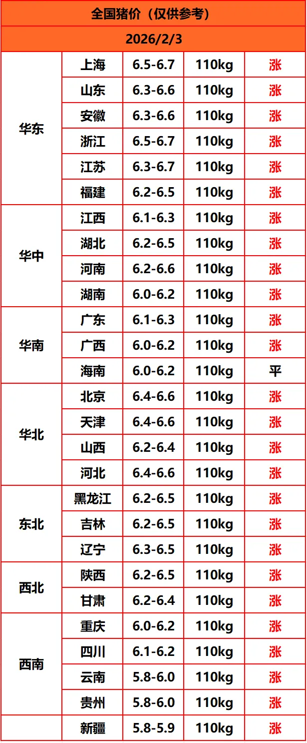 猪价继续上涨!2月3日最新明日猪价!【2026/2/3周二】 养羊网 2026-02-02 猪价继续上涨!2月3日最新明日猪价!【2026/2/3周二】点击下方?和关注,为您推荐更多猪价信息2026年1月31日猪价明日全国猪价行情走势26涨1平0跌? 养羊网 2026-02-02 上一篇:猪价未来走势 下一篇:【超前猪价大预测】2026年2月4日~2月7日!!全国猪价信息大预测! 您可能还会对下面的文章感兴趣111: 相关文章 一聚会就宰头羊是什么体验~~ 一张图了解三大猪企 近期价格更新!!! 两元一个的农村土鸡蛋,真的很贵吗?