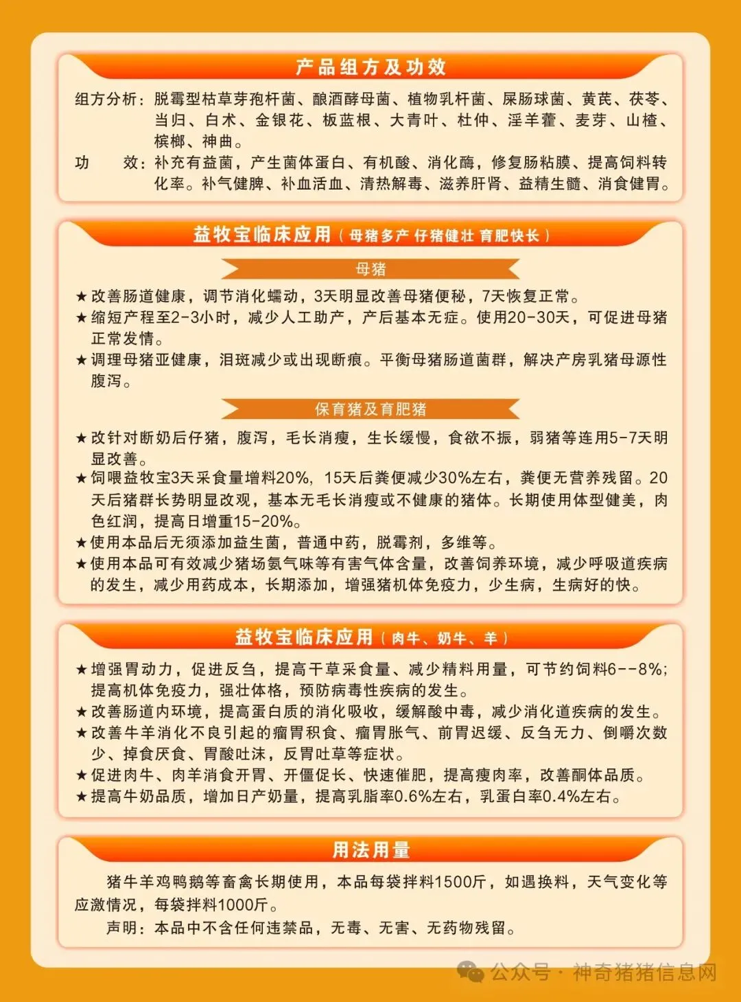 猪牛羊鸡鸭鹅都可使用,本品每袋拌料1500斤,如遇换料,天气变化等应激情况,每袋拌料1000斤。