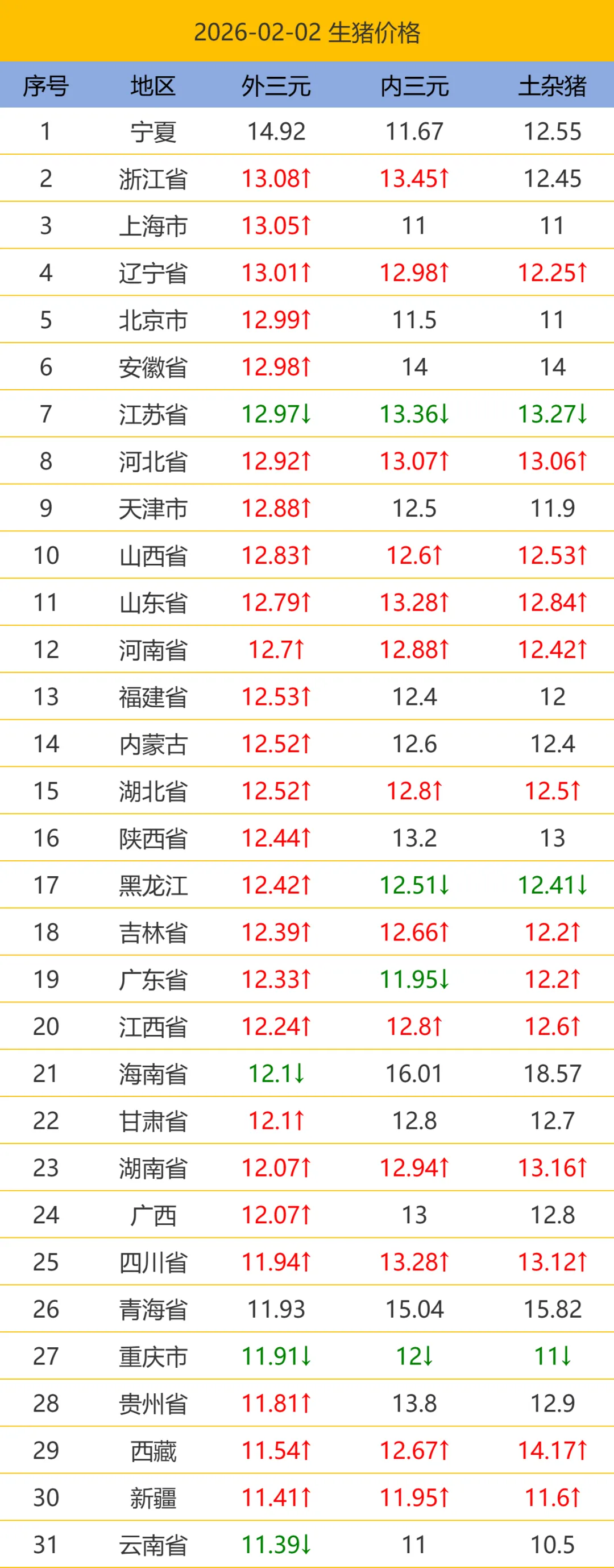 2026.02.02最新生猪价格.今日猪价,全国猪价. 养羊网 2026-02-02 2026.02.02最新生猪价格.今日猪价,全国猪价.以下猪价为平均价格(单位:元/公斤),市场时刻变动,报价不作交易依据,仅供参考。【需要更详细信息请到小程序查看】 养羊网 2026-02-02 上一篇:【明日猪价】2.3全国最新猪价(全面上涨) 下一篇:【明日猪价】2026.2.3-猪价满堂红! 您可能还会对下面的文章感兴趣111: 相关文章 2025年4月13日全国各地生猪价格信息 盐池滩羊肉 猪价风云突变,猪价、粮价迎新调整?三个好消息赶紧看! 2025年4月13日全国各地生猪价格信息