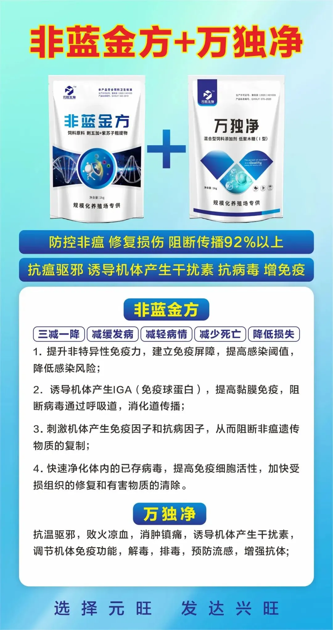 【主要功效】驱瘟避疫,修复脏器损伤,快速提高大群抗病力,3-5天降低猪群对非瘟病毒的易感性,形成免疫屏障,大幅降低发病率,7天压制潜伏期损伤,抑制DNA病毒复制,有效阻断传播92%以上!防控爆发性传播死亡!21天清除猪群体内游离病毒,净化非瘟、圆环、蓝耳、口蹄疫等多种病毒!加速转阴!为养殖保驾护航!保猪场平稳安全!
