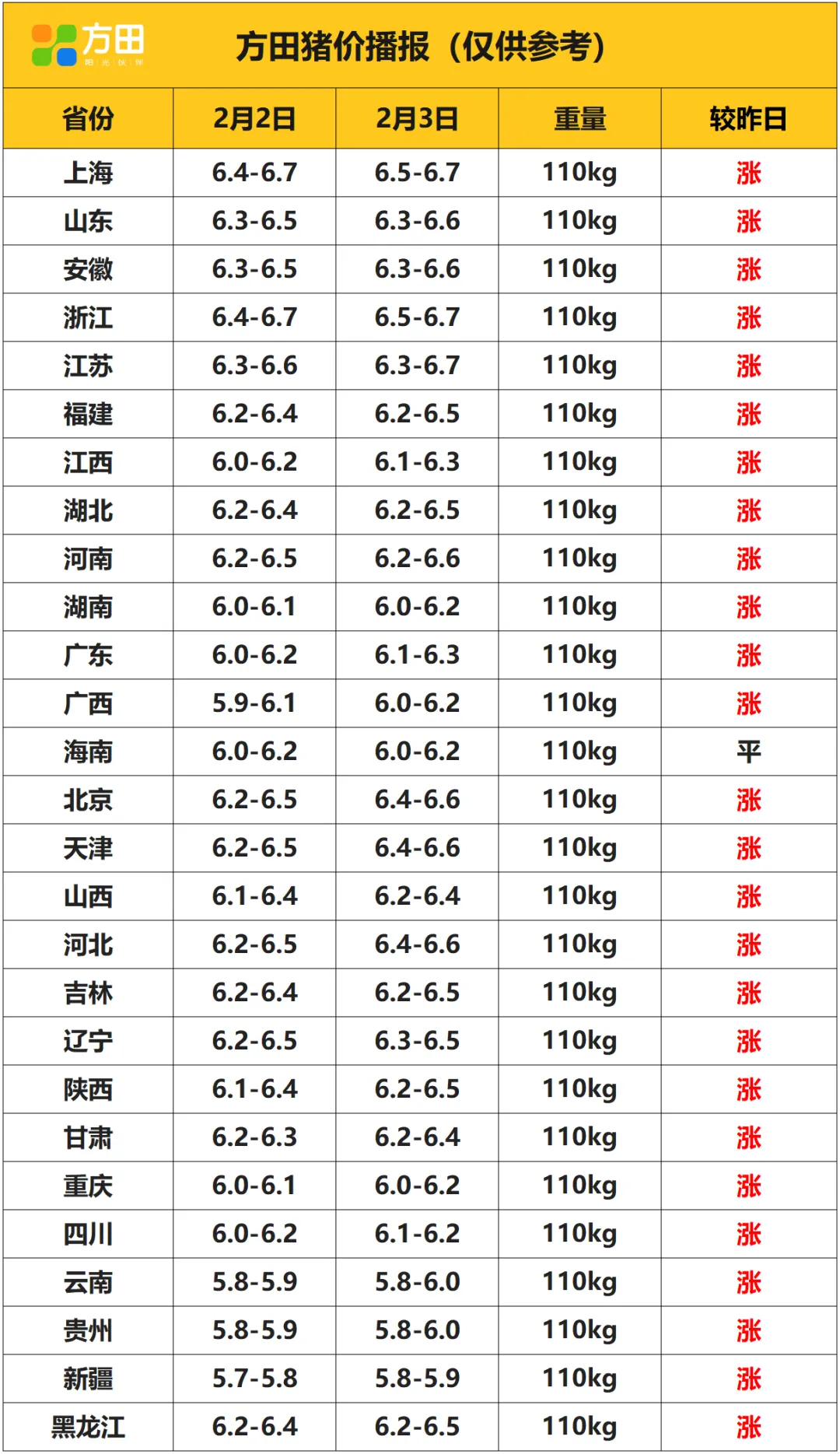 猪价丨2月3日 明日猪价早知道 养羊网 2026-02-02 猪价丨2月3日 明日猪价早知道 养羊网 2026-02-02 上一篇:涨!涨!涨!猪价全线大飘红!2.3明日生猪价格表 |2026.2.3|明天生早知道 下一篇:【报明天猪价】 2026.2.3 满堂红!继续涨! 您可能还会对下面的文章感兴趣111: 相关文章 真的受够考公了!!!!! 养生博主的食材购买大公开|价格对比 2025年4月13日全国各地生猪价格信息 山东慧丰源1月21日猪价行情