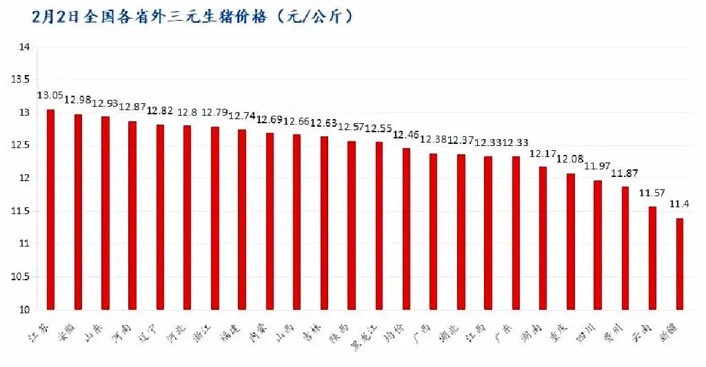 2月2日全国全国外三元生猪出栏均价为12.46元/公斤,较昨日上涨0.20元/公斤,最低价新疆11.40元/公斤,最高价江苏13.05元/公斤。