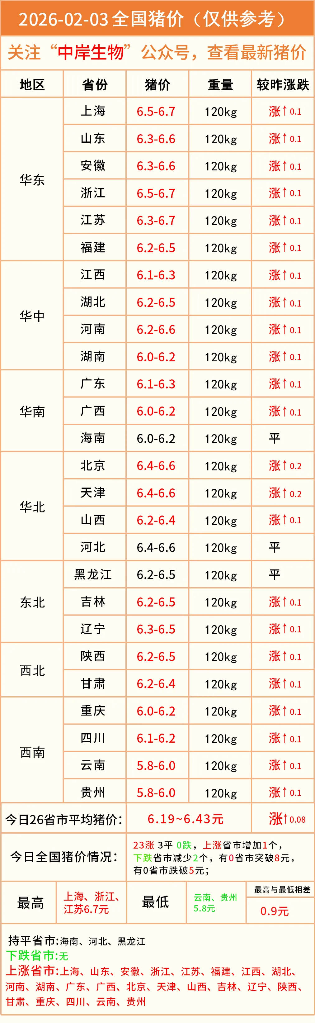 明日猪价|2026-02-03全国最新猪价(猪价已更新!) 养羊网 2026-02-02 明日猪价|2026-02-03全国最新猪价(猪价已更新!)营销中心丨0731-83806009技术服务丨0731-83806019 养羊网 2026-02-02 上一篇:明天猪价—2026.02.03全面上涨 下一篇:【华中猪价】26.2. 3 上涨为主!! 您可能还会对下面的文章感兴趣111: 相关文章 2025年4月13日全国各地生猪价格信息 那些被嫌弃的行业,正在闷声发大财 偶然发现的泥巴财富:卖腐殖土年入20万元 【超前猪价】2月2日 ~2月3日!全国猪价大预测!