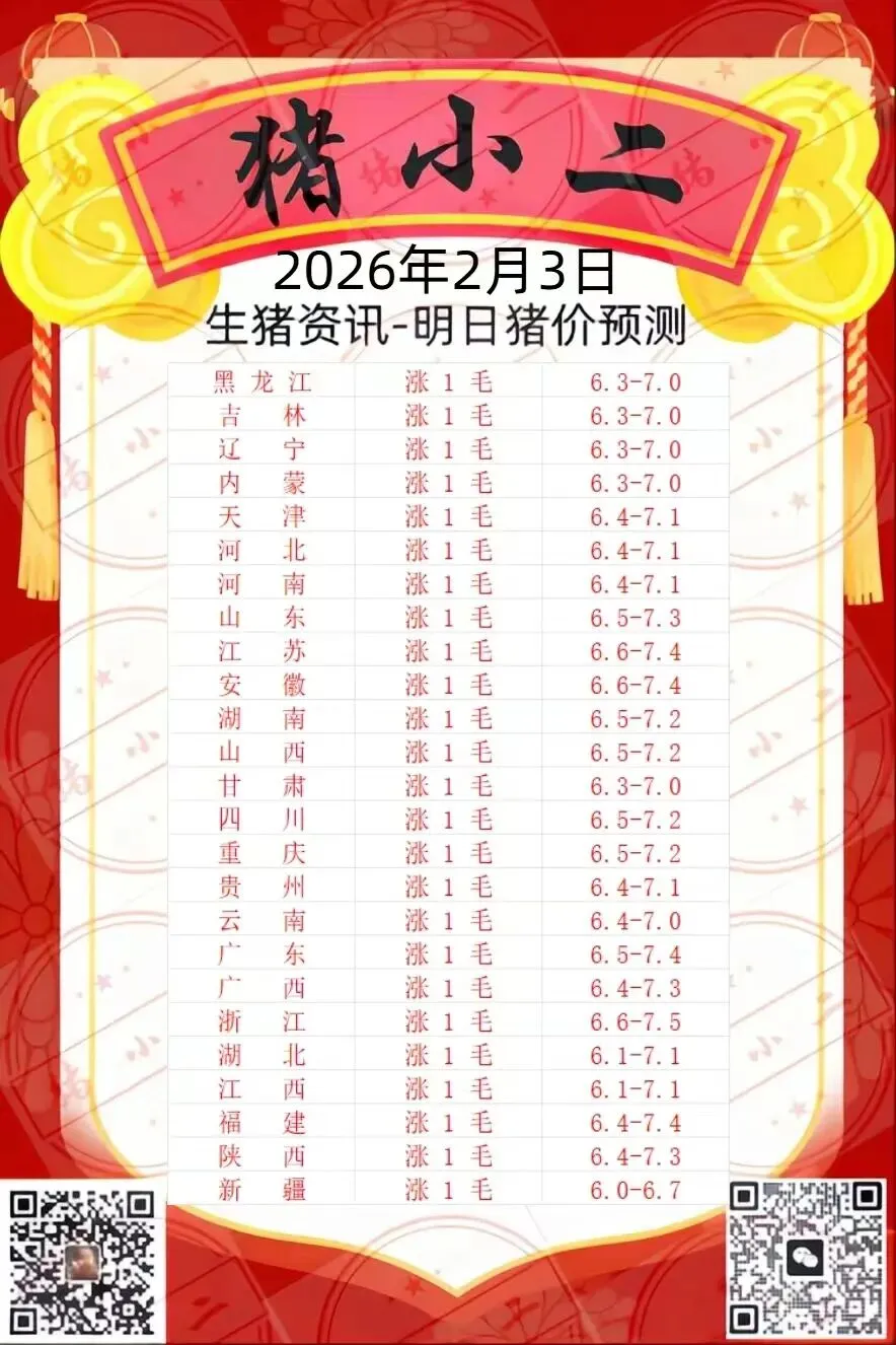 【猪小二】2.3日全国猪价预测:涨 养羊网 2026-02-03 【猪小二】2.3日全国猪价预测:涨 养羊网 2026-02-03 上一篇:【超前猪价】2月3-2月5日 猪价!全国猪价大预测 下一篇:一夜飙涨,猪价上涨“猛抬头”! 您可能还会对下面的文章感兴趣111: 相关文章 超前猪价预测:全国猪价稳中偏强,但上涨空间有限! 鹿犬宝宝生了一窝价格800-1800不等 曹氏鸭脖这么贵吗?? 智能养殖与智慧养殖的结合未来发展的新趋势