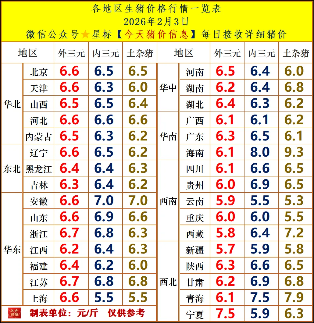 今日猪价 | 2026.2.4 明天猪价行情分析!2026年02月03日猪价行情:全国综合均价6.32元/斤 外三元:6.30元/斤,较昨日上涨0.10元 内三元:6.55元/斤,较昨日上涨0.07元 土杂猪:6.41元/斤,较昨日上涨0.07元
