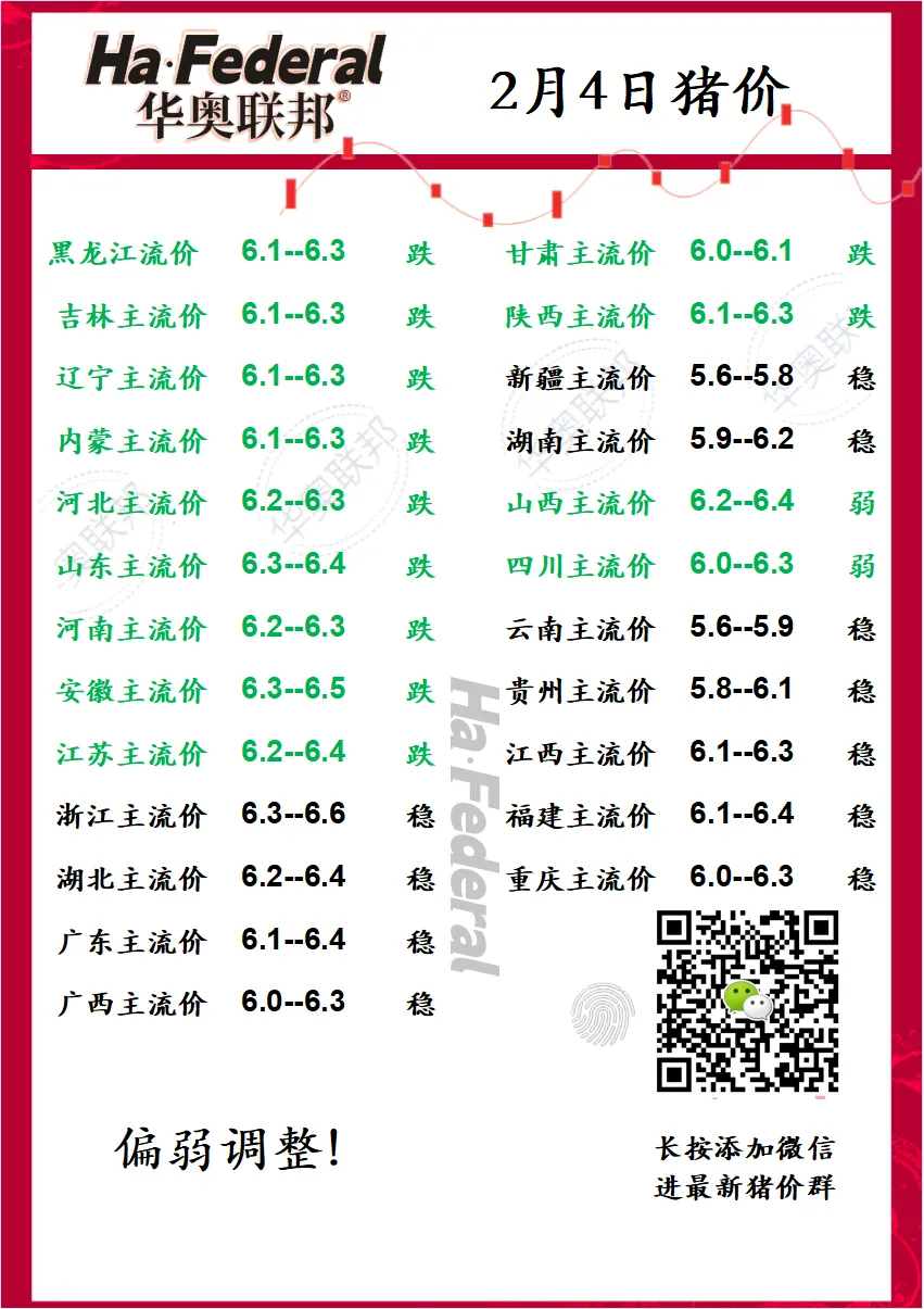 2月4最新猪价 风向突变 养羊网 2026-02-03 2月4最新猪价 风向突变进最新报价群 加微信 v联系电话:137 ?0084 ?5054 养羊网 2026-02-03 上一篇:【明日猪价】2月4日猪价下跌为主 下一篇:【国科快资讯】猪价大跌仍盈利?2026年养殖利润要悬了! 您可能还会对下面的文章感兴趣111: 相关文章 2025年4月13日全国各地生猪价格信息 2026.1.7 --鸡蛋价格 今日猪价|明日猪价2026.1.25(仅作参考) 常见山羊图鉴(二)