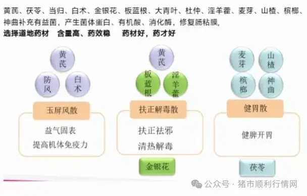 黄芪、茯苓、当归、白术、金银花、板蓝根、大青叶、杜仲、淫羊藿、麦芽、山楂、槟榔、神曲补充有益菌,产生菌体蛋白、有机酸、消化酶,修复肠粘膜