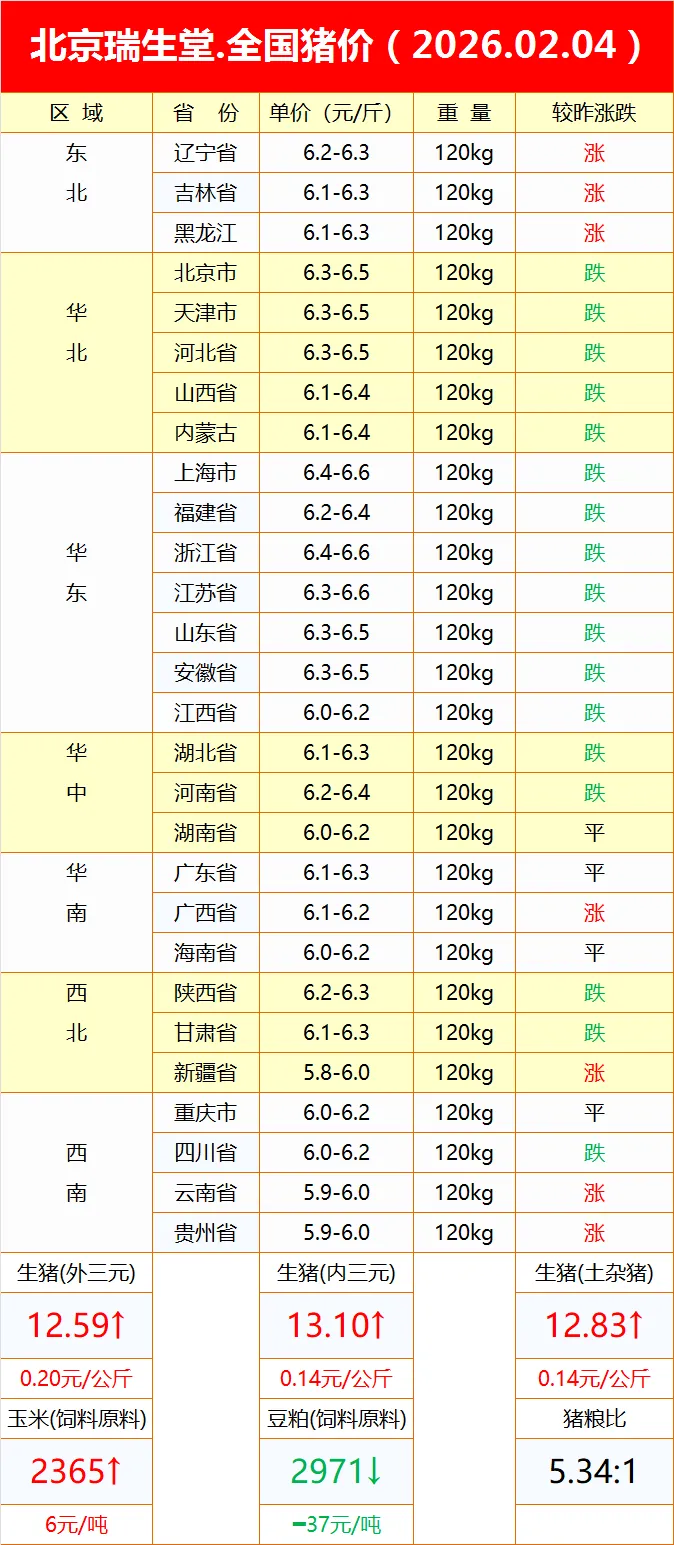 【每日猪价】北京瑞生堂猪价(2026-02-04)全国猪价