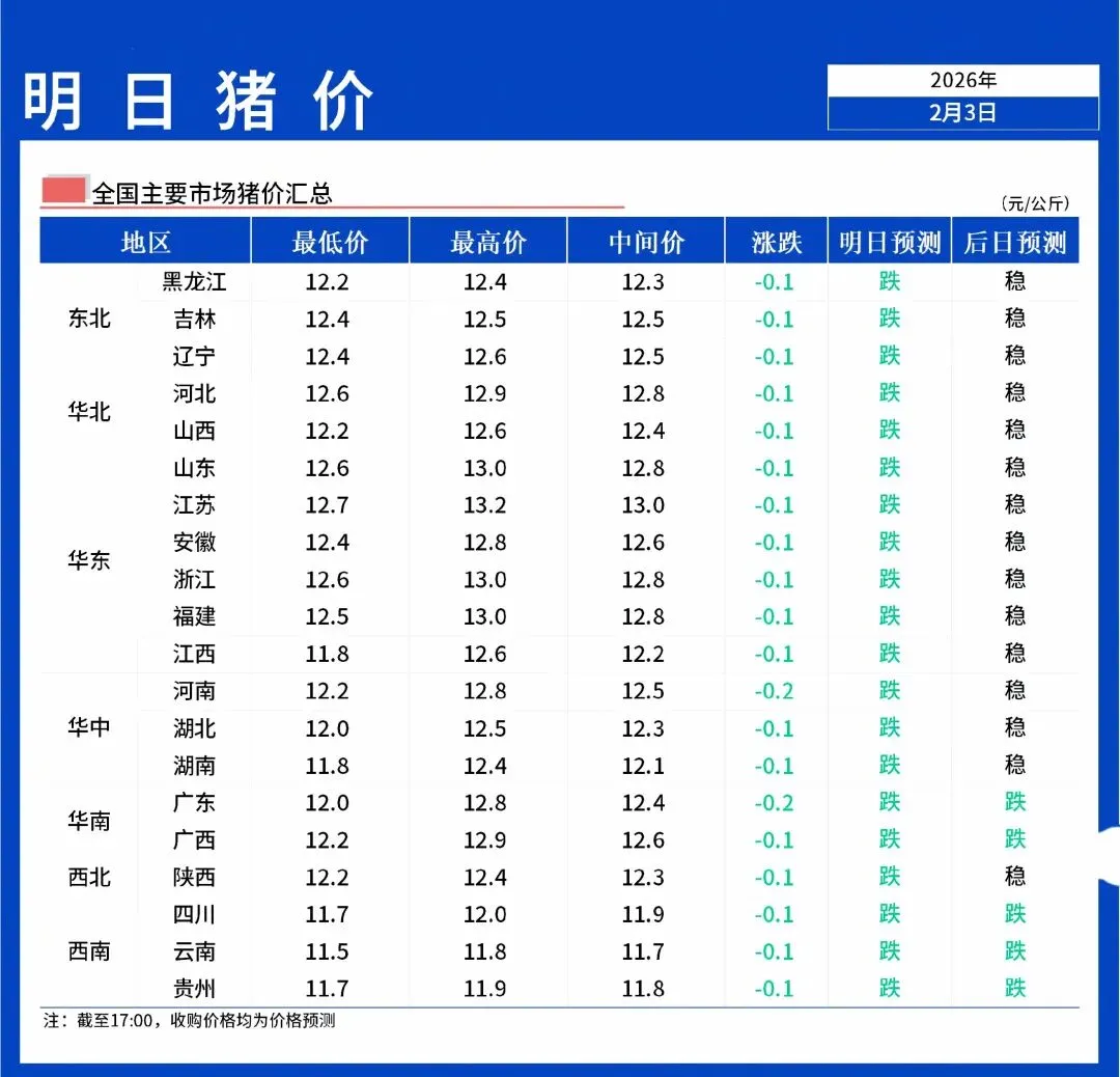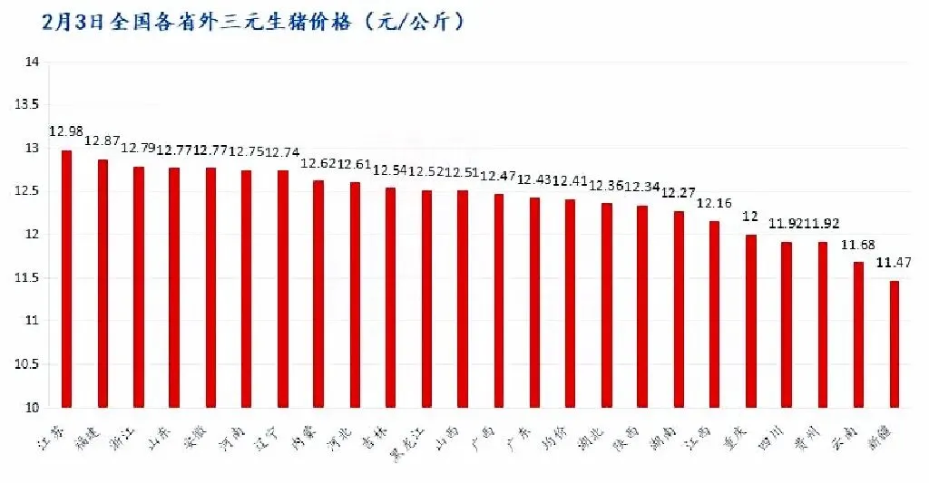 2月3日全国外三元生猪出栏均价为12.41元/公斤,较昨日下跌0.05元/公斤,最低价新疆11.47元/公斤,最高价江苏12.98元/公斤。