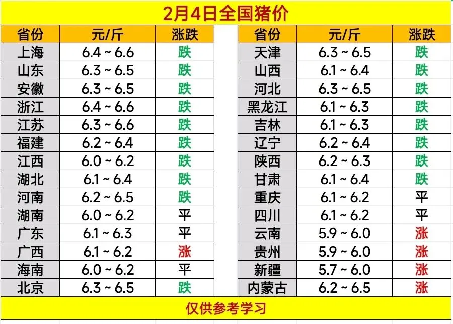 2026.2.4——明日猪价预测 养羊网 2026-02-04 2026.2.4——明日猪价预测 养羊网 2026-02-04 上一篇:【明日猪价】2月4日全国猪价下跌为主! 下一篇:【超前猪价】2月5-2月7日 猪价!全国猪价大预测 您可能还会对下面的文章感兴趣111: 相关文章 2025年4月13日全国各地生猪价格信息 你们为不弄黑五的鸡蛋和大米! 43°9,赤峰本地人都爱去的羊火锅点单攻略?? 低价卖羊山羊胡羊小羊羊肉 巢湖散兵