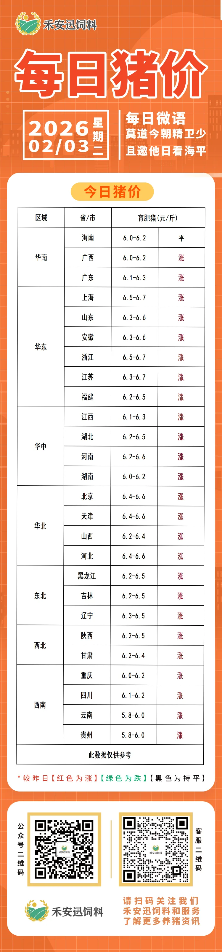 【02月03日猪价】今日各地生猪价格整体呈现大幅上涨态势