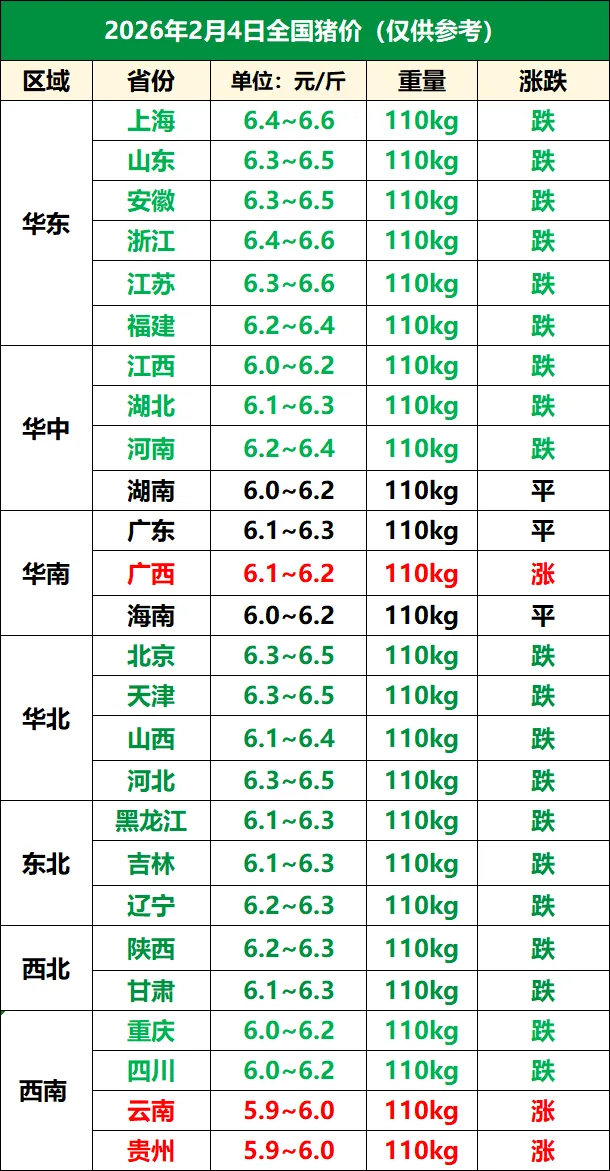 2月4日全国猪价一夜降温,下跌“猛抬头”!立春了质德集团祝您一帆风顺、二龙腾飞! 养羊网 2026-02-04 2月4日全国猪价一夜降温,下跌“猛抬头”!立春了质德集团祝您一帆风顺、二龙腾飞! 养羊网 2026-02-04 上一篇:2026年2月4日(早间)鸡蛋价格行情参考 下一篇:2026.02.04鸡蛋价格行情 您可能还会对下面的文章感兴趣111: 相关文章 近期价格更新!!! 无抗鲜鸡蛋 2025年4月13日全国各地生猪价格信息 2025年4月13日全国各地生猪价格信息