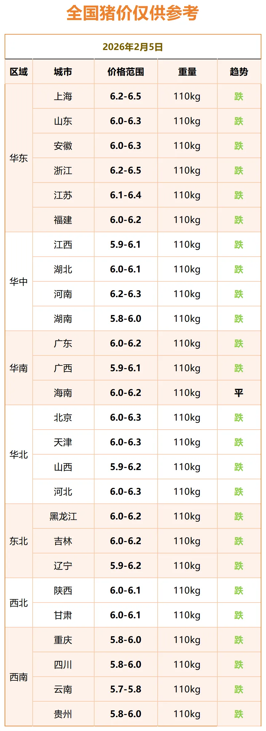 明日猪价早知道~全国地区猪价下跌只有一个地区猪价持平! 养羊网 2026-02-04 明日猪价早知道~全国地区猪价下跌只有一个地区猪价持平!猪价播报2026年2月5日全国猪价播报全国猪价播报~END~长按识别二维码关注我们 养羊网 2026-02-04 上一篇:明日猪价 | 2026.2.5日~全国各地最新猪价 下一篇:全国猪价情况:今日立春~人随春好、春与人宜、愿一切美好如期而至、你我共迎春暖花开 您可能还会对下面的文章感兴趣111: 相关文章 近期价格更新!!! 2025年4月13日全国各地生猪价格信息 2025年4月13日全国各地生猪价格信息 真的可以尽早完成自己的原始资本积累