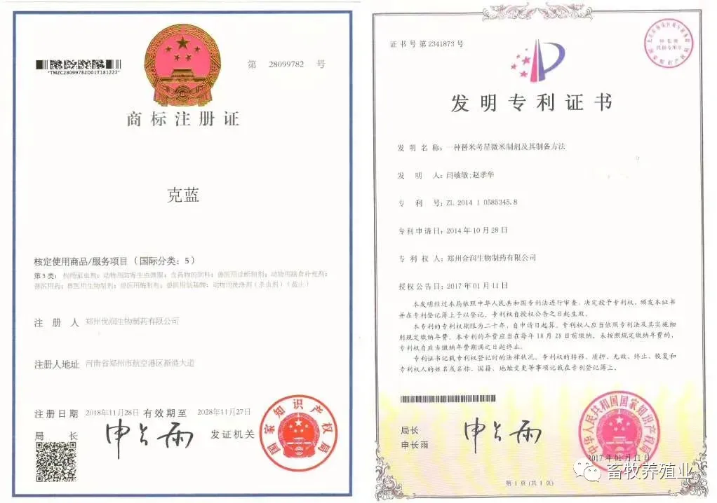 下图是克蓝专利证书,商标注册证书
