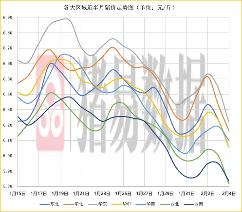 东北、西北、华北、华中、华东、西南、华南地区猪价呈现下跌,生猪平均价格继续下跌。