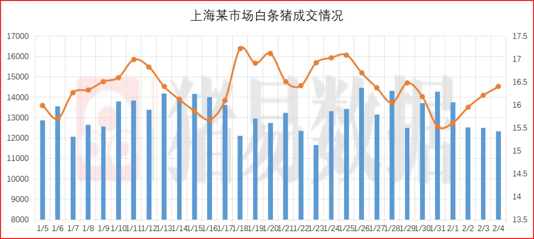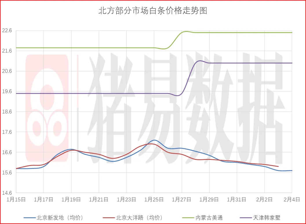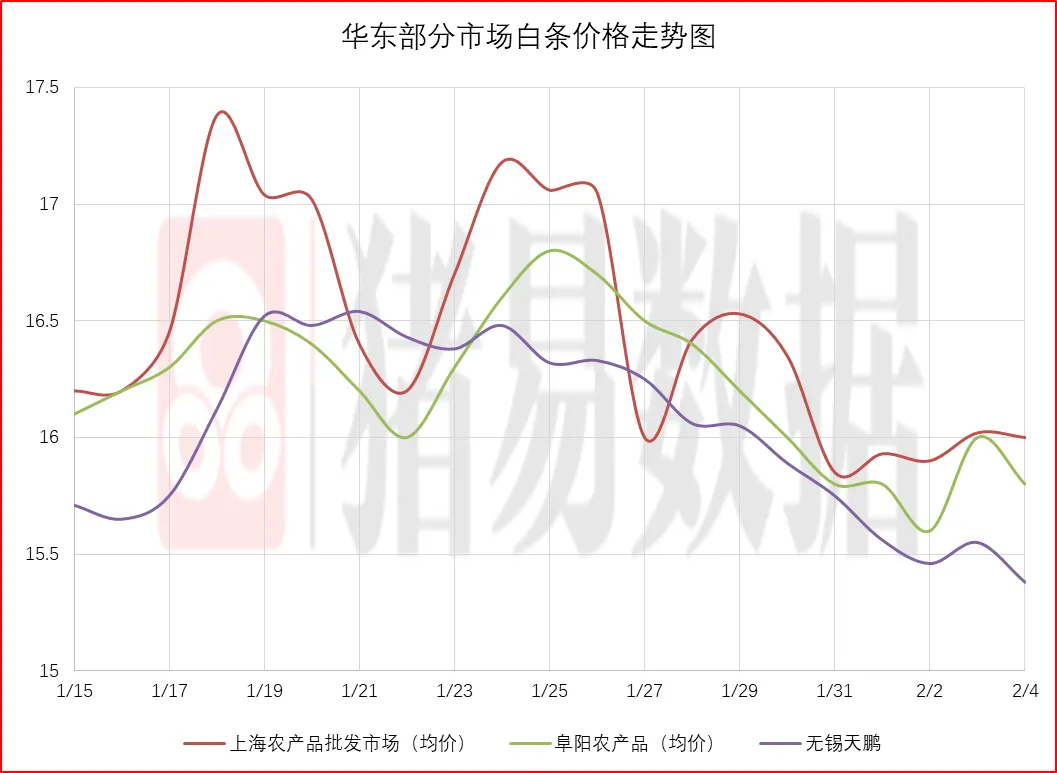 从今日北京、上海消费城市批发市场白条价格走势来看,北京、上海批发市场白条开磅价格呈现跌涨调整,北京大部分市场开磅价格下跌0.2元/公斤,市场走货速度表现一般偏差;上海市场价格呈现跌涨调整,部分市场成交价参考16.0-16.4元/公斤,到货量表现有所减少,市场交易情绪较表现一般,市场成交均价表现一般。