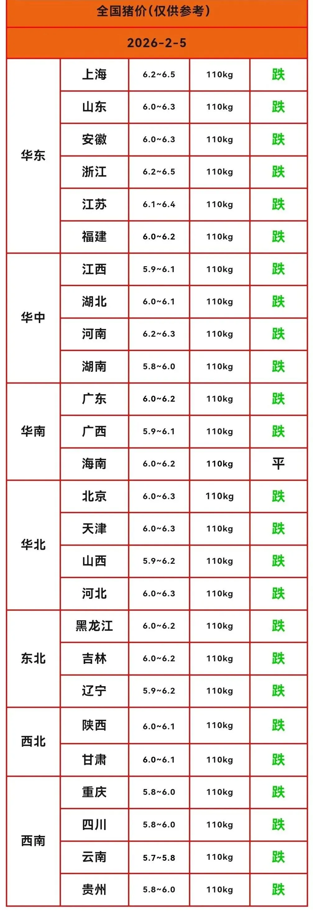 【明日猪价】2月5日猪价继续下跌,除了海南猪价持平,其他省份全部下跌! 养羊网 2026-02-04 【明日猪价】2月5日猪价继续下跌,除了海南猪价持平,其他省份全部下跌! 养羊网 2026-02-04 上一篇:猪价行情(2026.2.5)︱仅供参考 下一篇:今日鸡蛋价格(2026.2.4) 您可能还会对下面的文章感兴趣111: 相关文章 近期价格更新!!! 《地上的云朵》劳动美学:泥土与棉絮间的人 近期价格更新!!! 从需求端角度聊聊鸡蛋后市行情