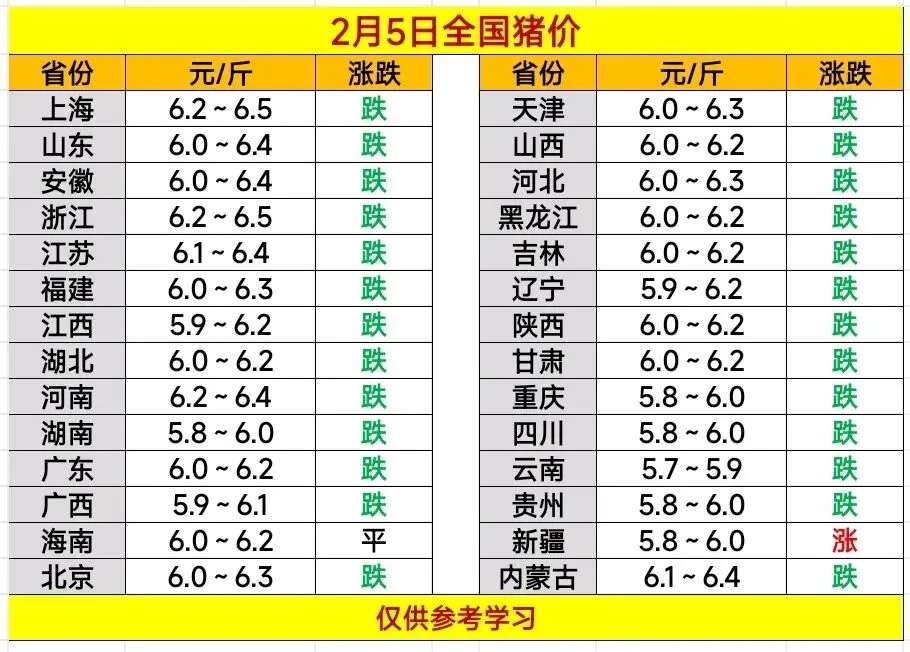 2026.2.5——明日猪价预测 养羊网 2026-02-04 2026.2.5——明日猪价预测 养羊网 2026-02-04 上一篇:2026年2月5日 全国猪价 下一篇:2026.2.5明日猪价 您可能还会对下面的文章感兴趣111: 相关文章 侏儒羊可可爱爱 湾区鸡蛋已经?16.99了??? 不是,鸡蛋真的不要钱了吗? 微笑小羊