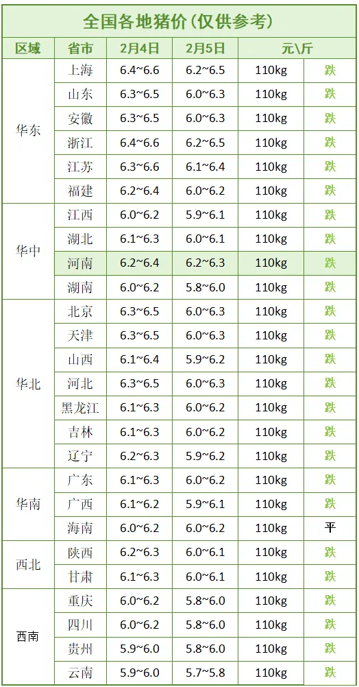 | ? ? 2 月 5 日全国猪价全线走弱,集团场增量出栏叠加散户集中出栏,市场供应宽松;终端消费提振有限,屠宰端压价明显,短期供强需弱格局延续,猪价承压下行。 |