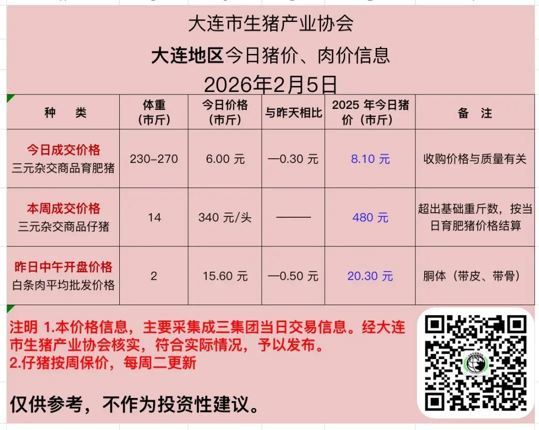 2026 年 2 月 5 日猪价、肉价信息 养羊网 2026-02-05 2026 年 2 月 5 日猪价、肉价信息天天报价大连市生猪产业协会 养羊网 2026-02-05 上一篇:贵州遵义鸡蛋价格:2月5日 下一篇:【明日猪价】2026.02.06:猪价大幅下滑!!! 您可能还会对下面的文章感兴趣111: 相关文章 2025年4月13日全国各地生猪价格信息 近期价格更新!!! 猪价一览|2026年1月28日 (明日猪价早知道) 大理州正宗巴马香猪报价