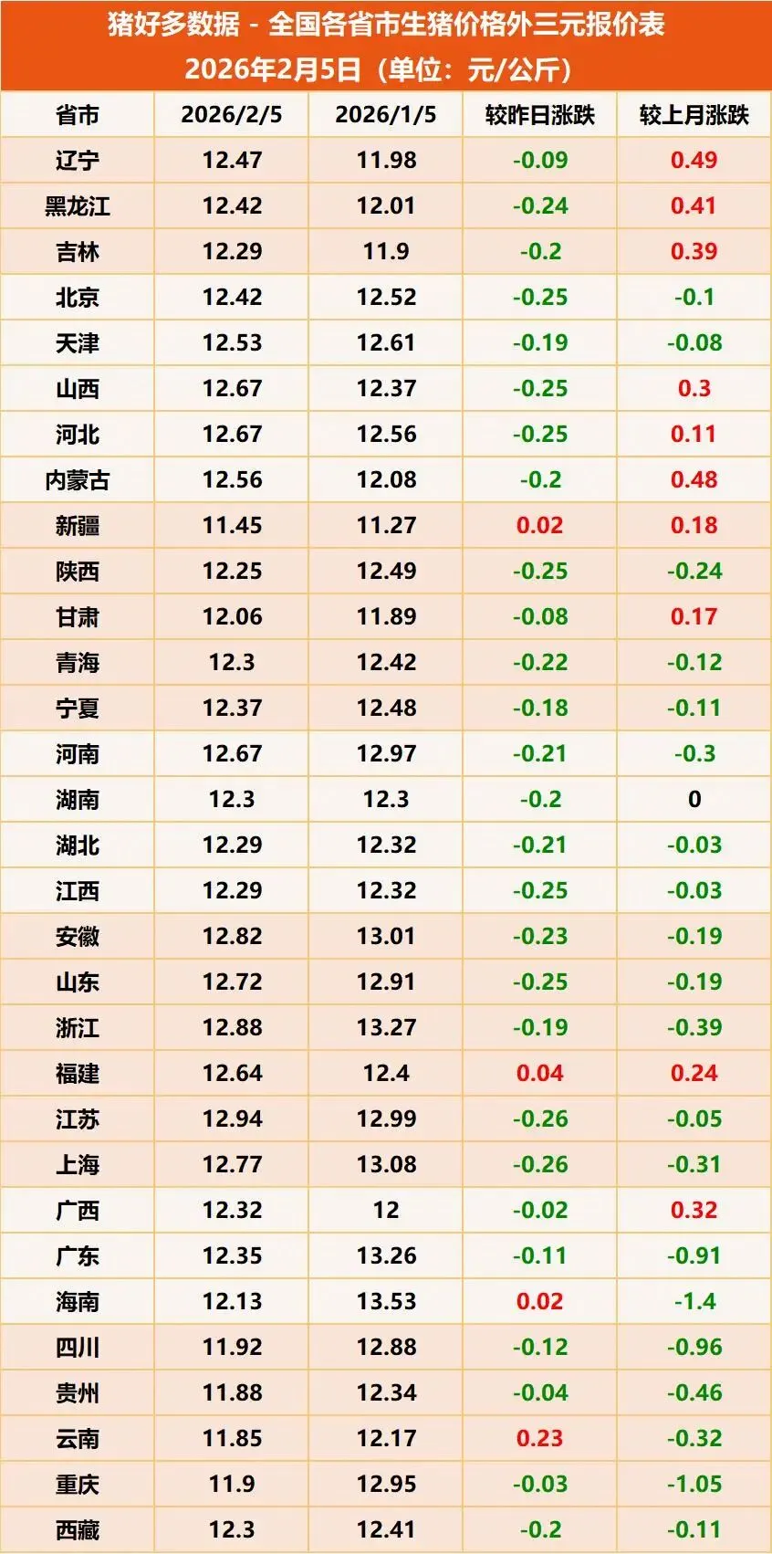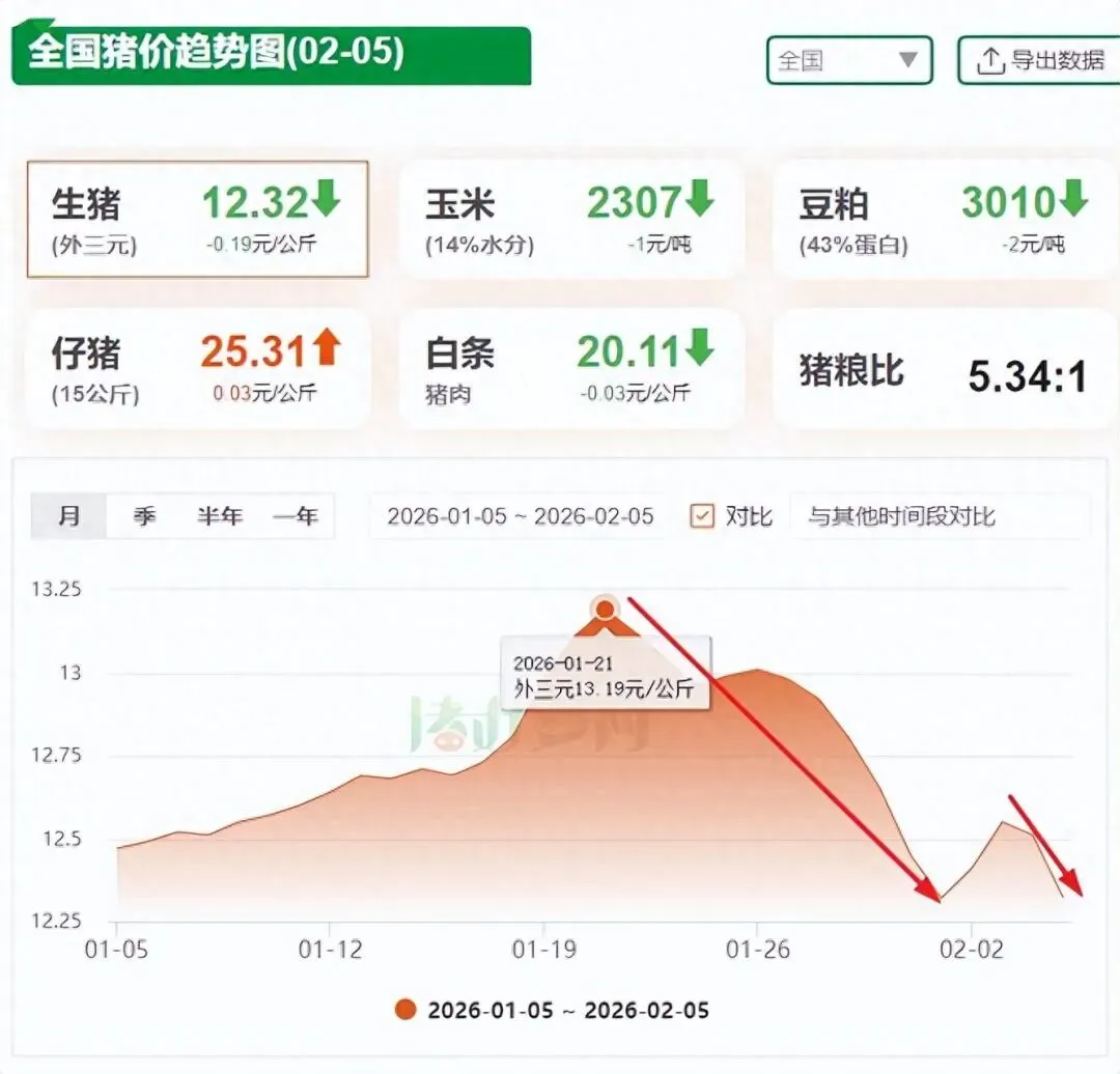 今日是农历腊月十八,距离春节越来越近了,近两日猪价也在持续尝试反扑,但却以失利告终!据猪好多数据监测显示,2026年2月5日全国外三元生猪均价为12.32元/公斤,较昨日下跌0.19元/公斤,叠加昨日0.04元/公斤的跌幅,猪价2天大跌0.23元/公斤,猪价“逢节就跌”的戏码似乎又有上演!