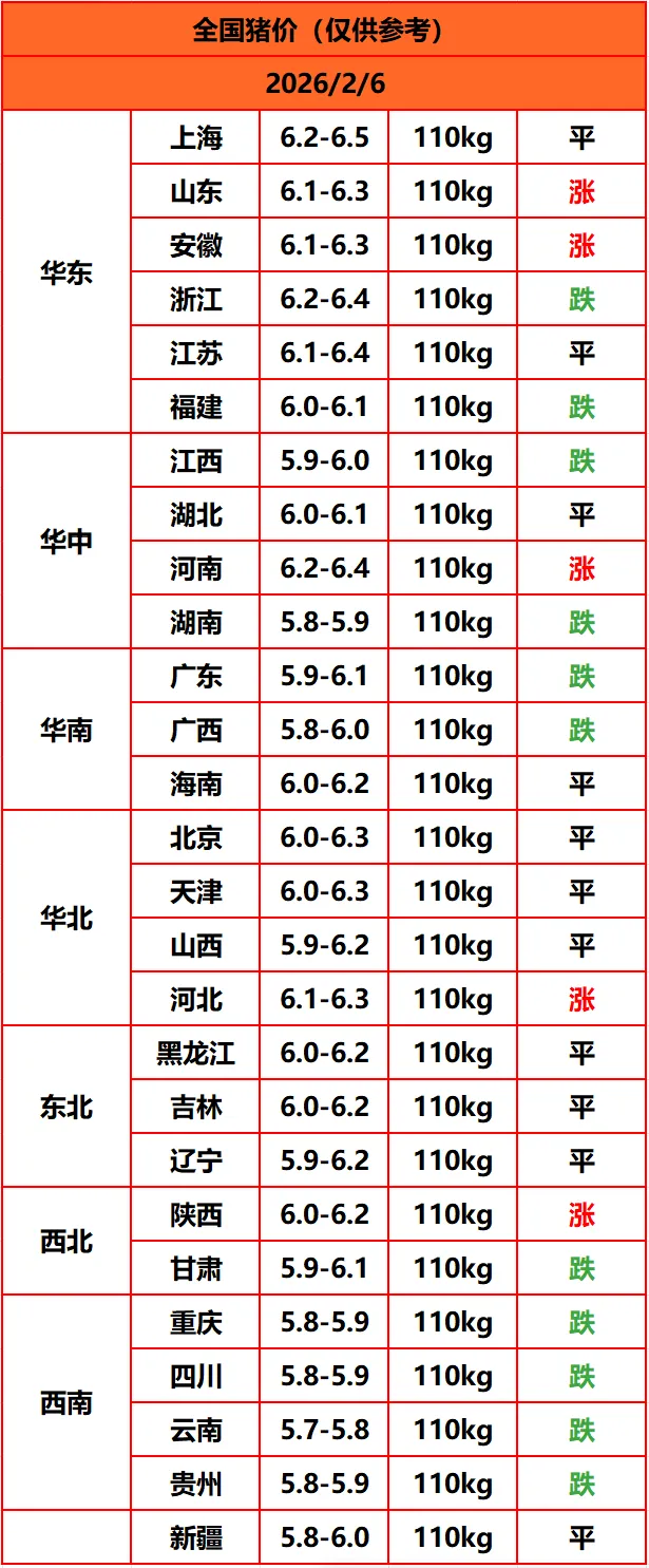 猪价涨跌互现!2月6日最新明日猪价!【2026/2/6周五】 养羊网 2026-02-05 猪价涨跌互现!2月6日最新明日猪价!【2026/2/6周五】点击下方?和关注,为您推荐更多猪价信息2026年2月6日猪价明日全国猪价行情走势5涨11平11跌? 养羊网 2026-02-05 上一篇:【猪价预测】2月7-2月9日 猪价预测 下一篇:【落】2月5日鸡蛋价格/老母鸡价格/原料价格/鸡雏价格 您可能还会对下面的文章感兴趣111: 相关文章 近期价格更新!!! 2025年4月13日全国各地生猪价格信息 中农网周报价(24.8.12-24.8.18) 胖东来茶叶价格表