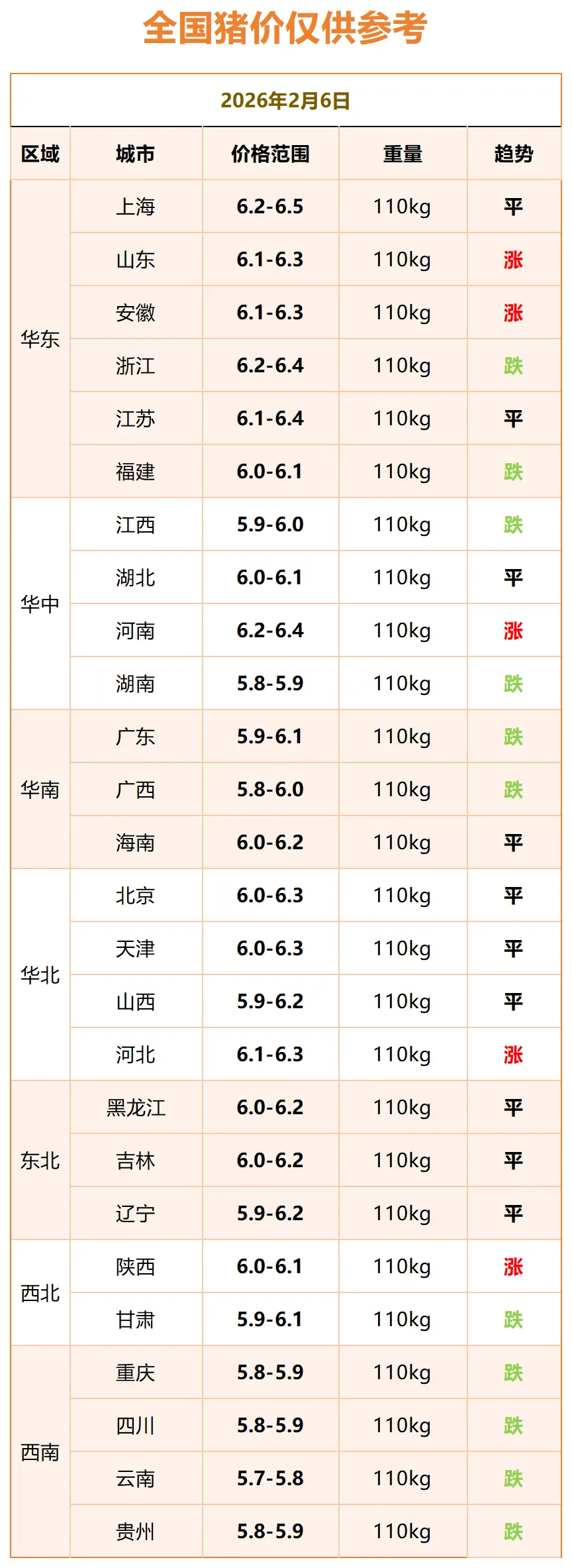 明日猪价早知道~全国大部分地区猪价有涨有跌,部分地区猪价持平! 养羊网 2026-02-05 明日猪价早知道~全国大部分地区猪价有涨有跌,部分地区猪价持平!猪价播报2026年2月6日全国猪价播报全国猪价播报~END~长按识别二维码关注我们 养羊网 2026-02-05 上一篇:跌!跌!跌!2026年2月5日鸡蛋价格天天报价网,2026年2月5日鸡蛋价格最新表,天天查询 下一篇:【超前猪价大预测】2月7日~2月10日!节前猪价难改震荡偏弱格局 您可能还会对下面的文章感兴趣111: 相关文章 近期价格更新!!! 近期价格更新!!! 哇,买到一条超不错的五花肉! 正宗盐池滩羊比宁夏滩羊贵8元