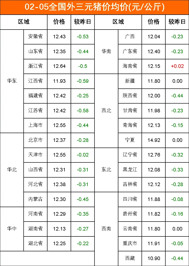 明日猪价:2026-02-06(元/斤)浙江6.2-6.4跌江苏6.1-6.4平福建6.0-6.1跌 江西5.9-6.0跌湖北6.0-6.1平河南6.2-6.4涨