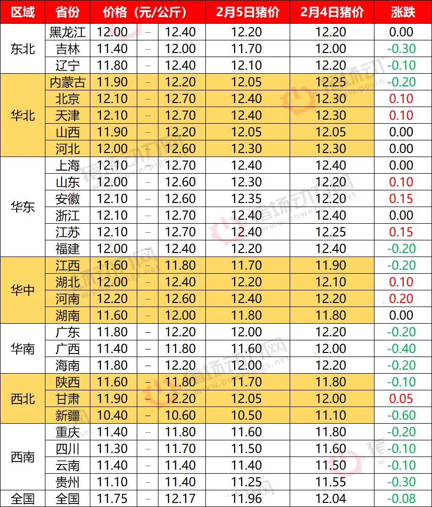 据统计,2月5日,屠宰企业散户主流收购120公斤-130公斤标准体重生猪平均价格为11.96元/公斤,较昨日价格下跌0.08元/公斤。14个省份猪价下跌,8个省份猪价上涨,6个省份猪价企稳。 目前全国最高价为北京、天津、上海、浙江、江苏、河南,价格为12.40元/公斤,较昨日价格不变或上涨0.10-0.20元/公斤;全国最低价为新疆,价格为10.50元/公斤,较昨日价格下跌0.60元/公斤。