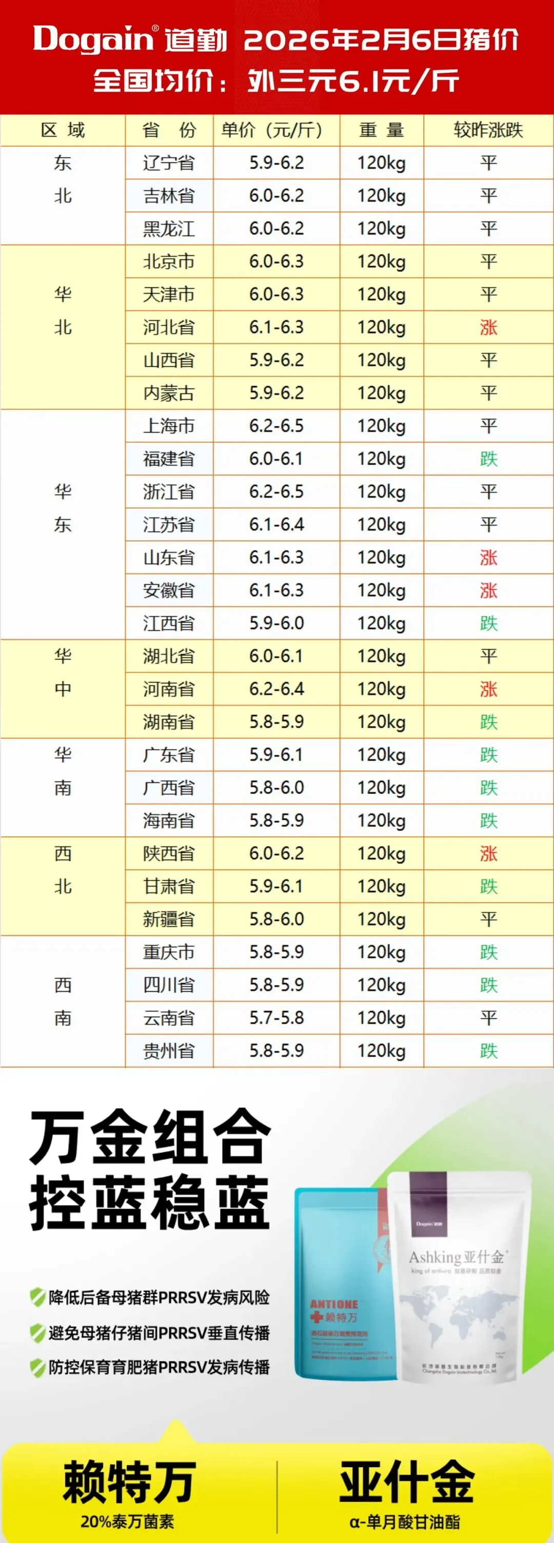 2月6日,猪价信息 养羊网 2026-02-05 2月6日,猪价信息 养羊网 2026-02-05 上一篇:明日猪价2026.2.6(最新猪价) 下一篇:2026.02.06-明天猪价(整体下跌,局地飘红!) 您可能还会对下面的文章感兴趣111: 相关文章 【明日猪价】2026-2-6全国生猪价格(部分地区反弹上涨,下跌势头放缓) 2025年4月13日全国各地生猪价格信息 猪价反常6连跌,多地一夜下跌近3毛!春节前警惕一大风险… 2025年4月13日全国各地生猪价格信息