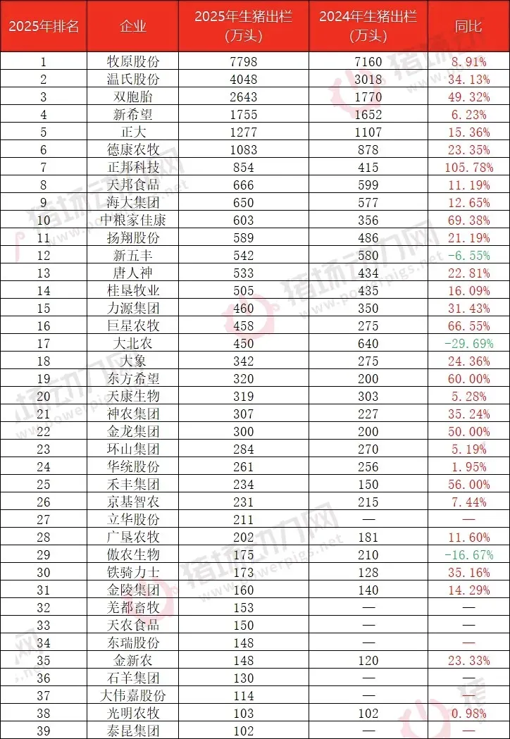一夜升温,猪价上涨“猛抬头”!2025年生猪出栏超100万的猪企共39家,2025年中国养猪巨头排行榜发布!