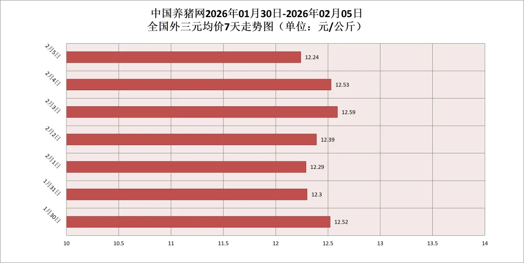 2026年02月05日(星期四),据中国养猪网猪价系统监测,全国外三元均价为12.24元/公斤,猪价较昨日(12.53元/公斤)下跌0.29元/公斤,较上月(12.48元/公斤)下跌了0.24元/公斤。