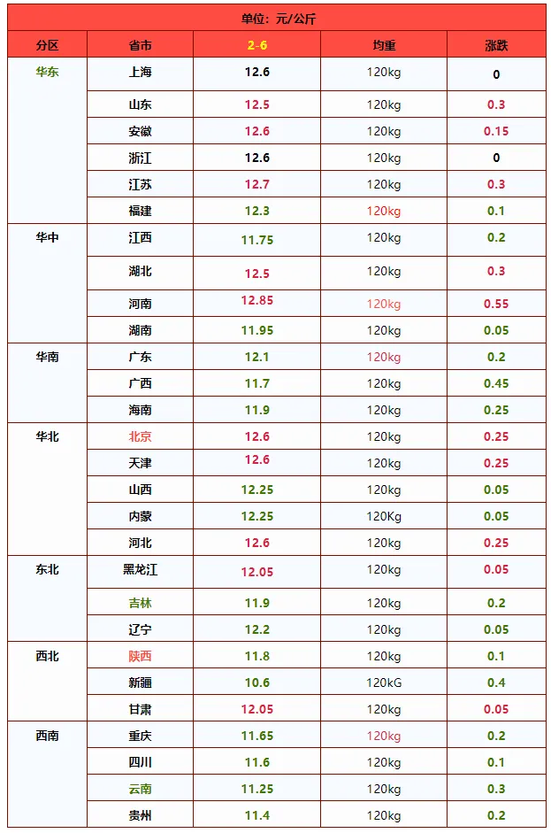 在此供需格局下,当前猪价总体震荡下行。但从基层实际反馈来看,市场情绪存在一定分歧:北方地区如河南,部分养殖企业因前期已减重出栏,春节前出栏压力相对有限,头部企业出现缩量提价操作,当地100~120公斤标猪报价上调0.3~0.4元/公斤,大体重猪源涨幅近0.8元。南方地区则普遍偏弱,主流规模场报价下调0.1~0.2元/公斤,散户价格也多下跌0.1~0.2元/公斤,仅东北局部报价略有反弹。