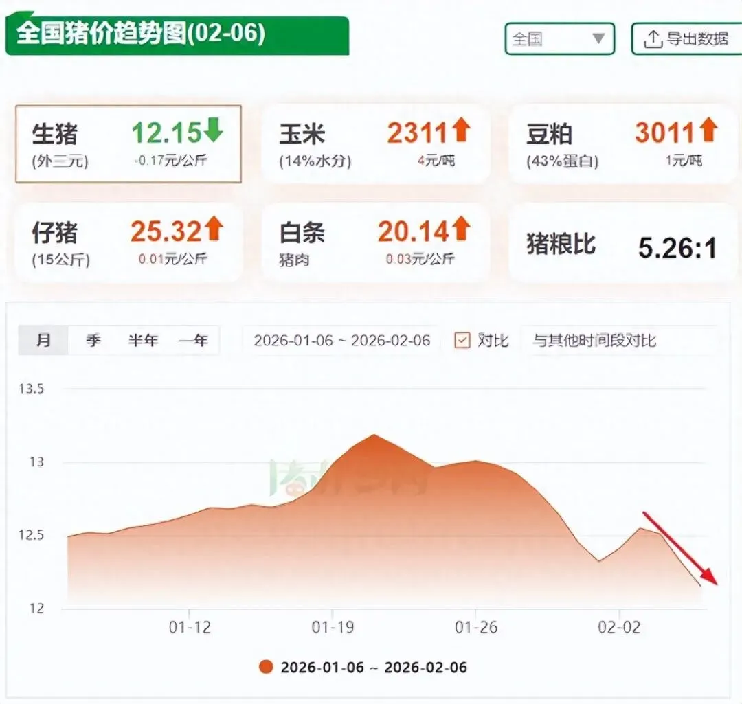 据猪好多数据监测显示,2026年2月6日全国外三元生猪均价为12.15元/公斤,较昨日下跌0.17元/公斤,叠加前两日的跌幅,猪价连续3天大跌4毛每公斤,多地猪价水平已跌回12元/公斤关卡。然而还有坏消息传来,又有利空冲击市场!