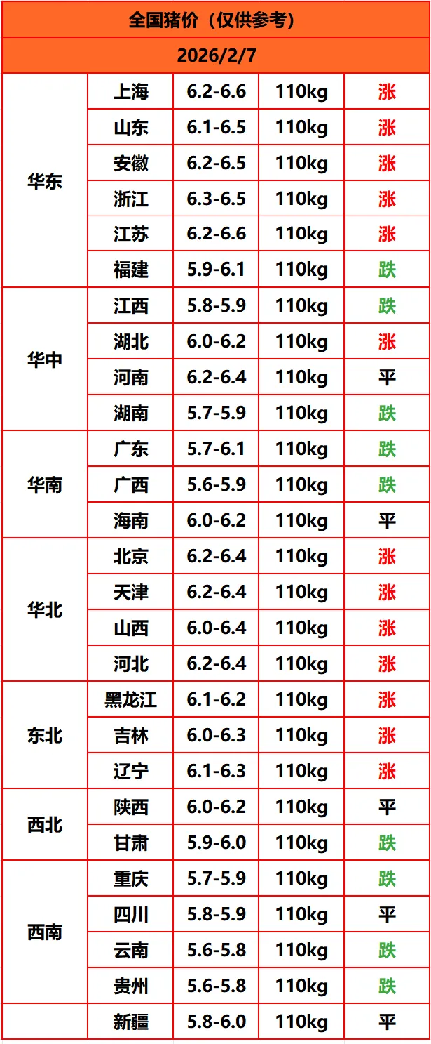 猪价区域走势分化加剧!2月7日最新明日猪价!【2026/2/7周六】 养羊网 2026-02-06 猪价区域走势分化加剧!2月7日最新明日猪价!【2026/2/7周六】点击下方?和关注,为您推荐更多猪价信息2026年2月7日猪价明日全国猪价行情走势13涨5平9跌? 养羊网 2026-02-06 上一篇:2026年2月6日 天合简报·鸡蛋价格 下一篇:2.7最新猪价 您可能还会对下面的文章感兴趣111: 相关文章 【明日猪价】9月12日全国猪价稳定运行! 便利店的鸡蛋2.2一个? 果然投胎是个技术活啊,人如此,羊也如此。 近期价格更新!!!