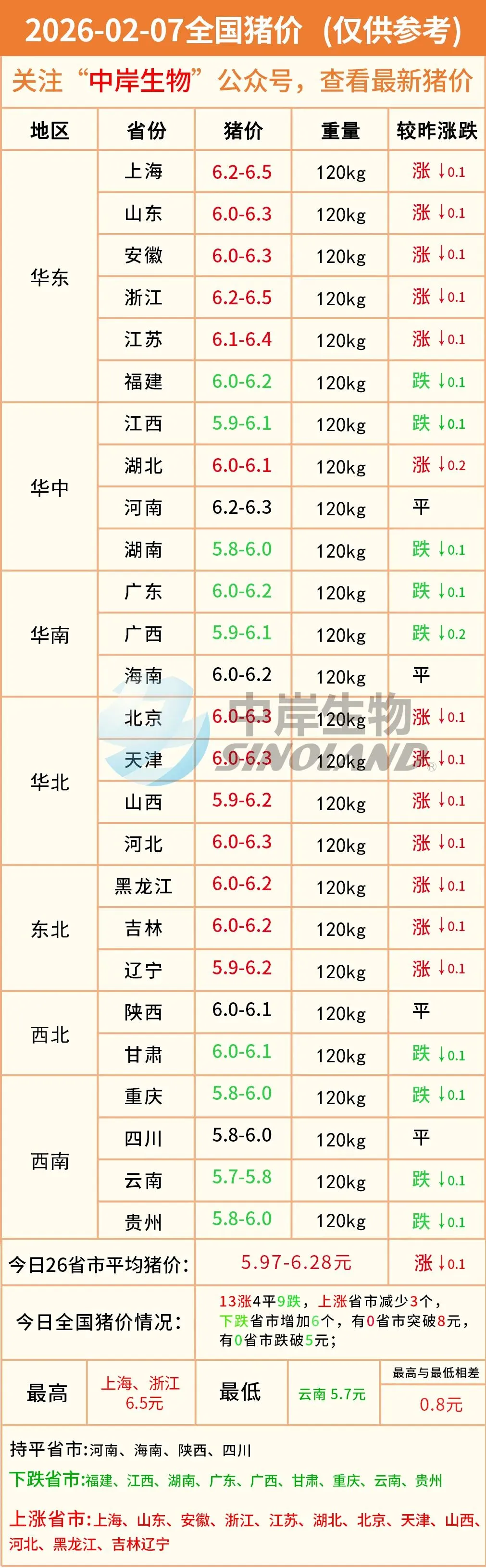 明日猪价|2026-02-07全国最新猪价(猪价已更新!) 养羊网 2026-02-06 明日猪价|2026-02-07全国最新猪价(猪价已更新!)营销中心丨0731-83806009技术服务丨0731-83806019 养羊网 2026-02-06 上一篇:2026年02月06号鸡蛋价格参考 下一篇:2026.2.7-伞猪明日猪价-多地上涨! 您可能还会对下面的文章感兴趣111: 相关文章 十堰市城区“价比三家”情况(10月14日) 猪价震荡走弱!2026.1.3明日猪价,猪价一片绿 卖鸡蛋卖鸡蛋 一元一个的土鸡蛋 《湖北荆门》褐壳鸡蛋价格2026年1月29日