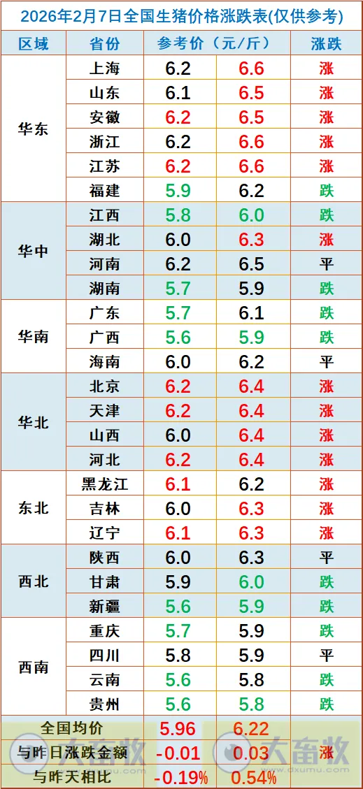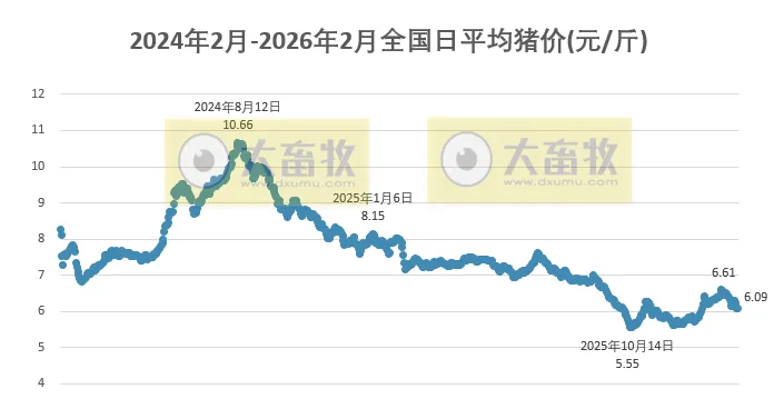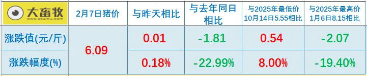 大畜牧根据我国27省的猪价数据,计算出2026年2月7日全国平均猪价为每斤6.09元,比昨天上涨0.01元,涨幅为0.18%,止跌小幅上涨。