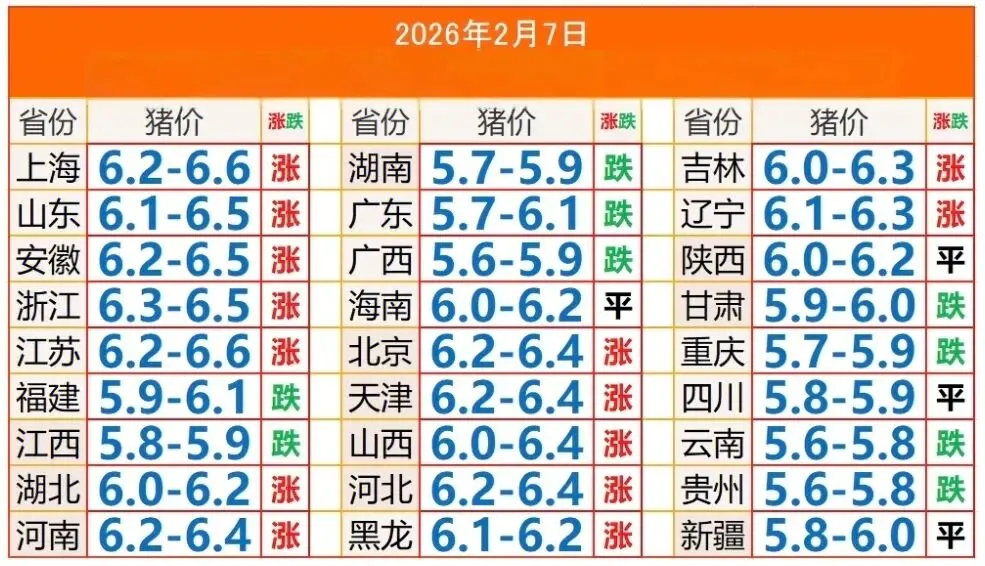 2026年2月7日 全国猪价信息 今日猪价 养羊网 2026-02-06 2026年2月7日 全国猪价信息 今日猪价 养羊网 2026-02-06 上一篇:明天猪价行情2026.2.7 下一篇:2026年2月7号最新猪价资讯-早报(稳中偏弱) 您可能还会对下面的文章感兴趣111: 相关文章 山姆!69.9降到49.9,好吃不贵的鸡蛋! 近期价格更新!!! 鸡蛋如期上涨,减仓走起! 近期价格更新!!!