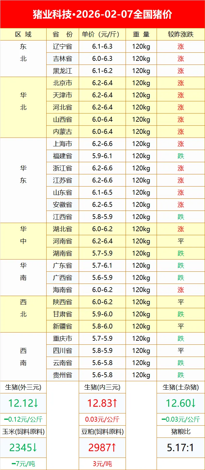 2026-02-07明日猪价 养羊网 2026-02-06 2026-02-07明日猪价? ?别忘了点个在看哦? 养羊网 2026-02-06 上一篇:2025猪价在低位震荡中收官,2026年能否迎来期待中的拐点? 下一篇:2026年2月6日 鸡蛋价格, 最新蛋价行情! 您可能还会对下面的文章感兴趣111: 相关文章 2025年4月13日全国各地生猪价格信息 大学城 烤炉鸡蛋灌饼!(附价格) 生猪行业大地震!国家三连重拳出击 卖自养黑山羊了