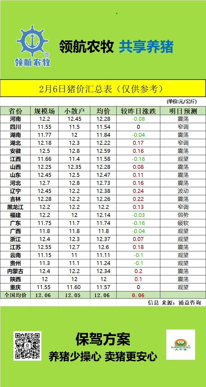 【超前猪价】2月6日全国猪价走势分析! ?展望后市,若无突发利好,短期内猪价大概率弱势震荡,养殖端出栏惯性及需求端缺乏爆发点难以承接大量供应,但深度下跌空间有限.