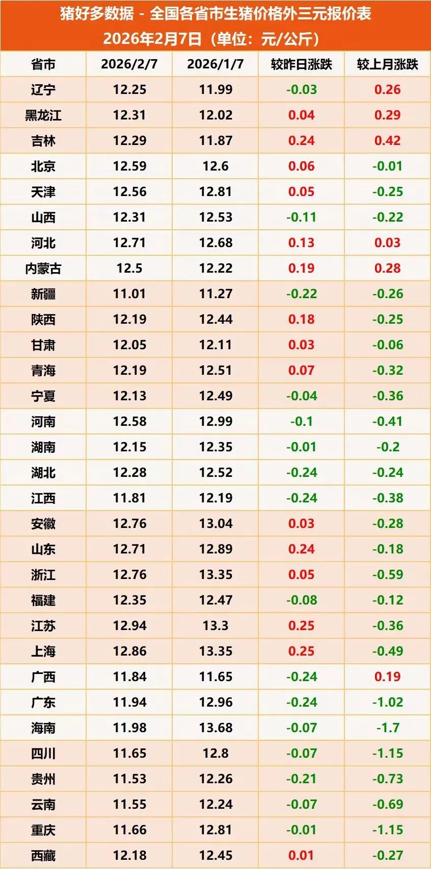 根据猪好多数据监测,2月7日全国外三元生猪均价为12.17元/公斤,北方地区较昨日有大范围反弹趋势,但南方则依旧下跌为主。