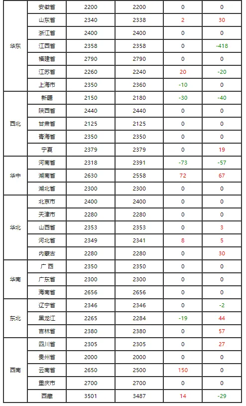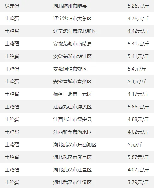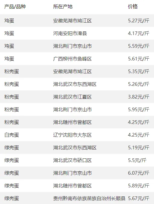 区域方面,主产区河北、山东、河南报价稳中有弱,河北沧州到户价3.6-3.7元/斤,山东菏泽泗水3.47-3.5元/斤,河南驻马店大码蛋3.6元/斤;湖北浠水粉蛋、江苏苏北褐壳蛋价格稳定,局部小幅回落。主销区北京、上海、广州走势分化,北京新发地批发价3.77元/斤,上海接货价小幅下跌,广州报价坚挺。