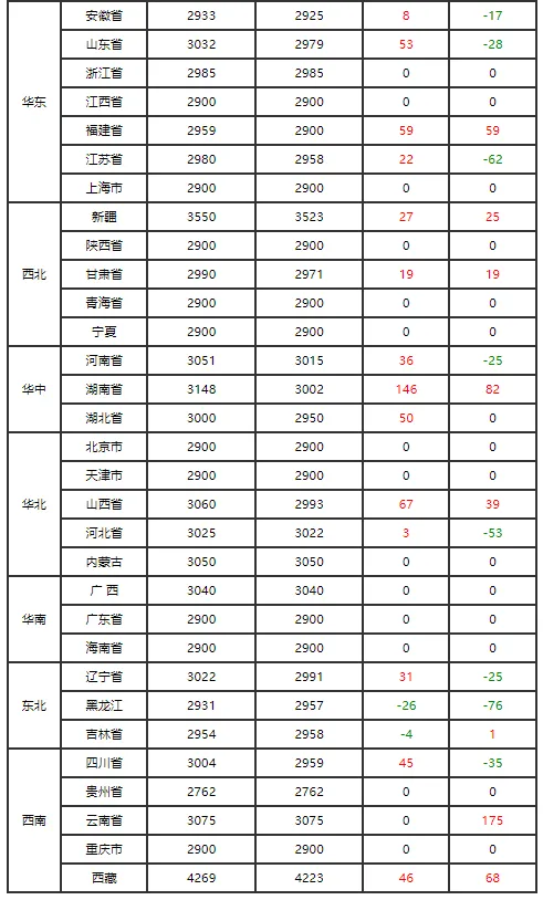 区域表现上,华东、华南部分地区涨幅突出,安徽涨幅最大,15kg外三元仔猪报价29.80-30.10元/公斤,环比上涨0.20元/公斤;山东、福建也有小幅上涨,山东报价29.95-30.00元/公斤。广东小幅下跌0.05元/公斤,其余多数地区价格持平,东北、西北产区保持稳定,调运改善带动局部需求回暖。