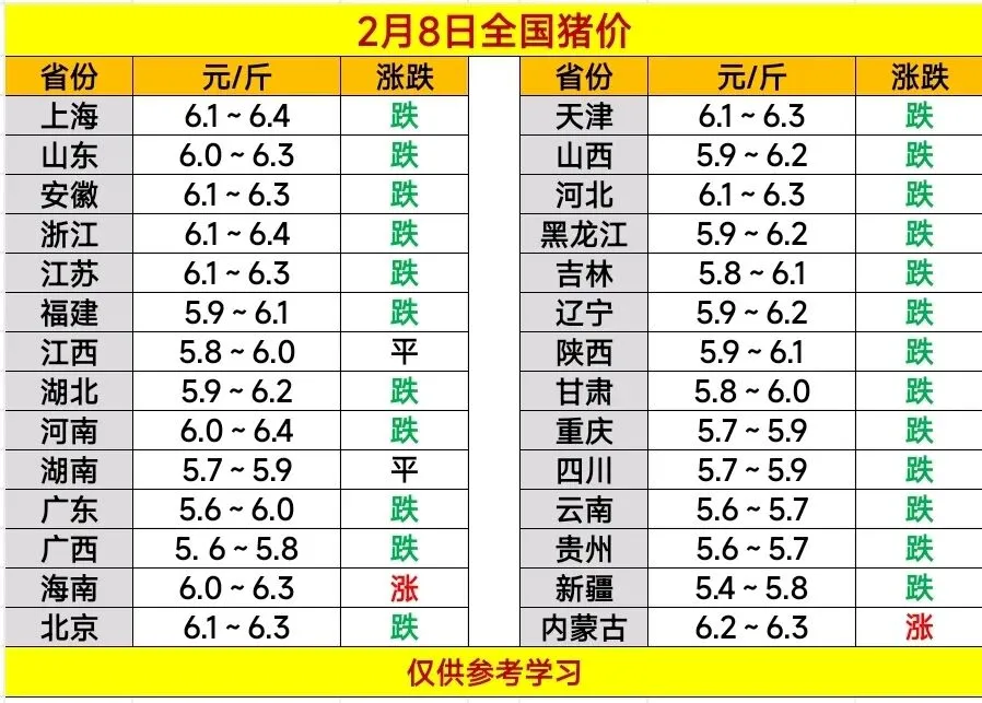 2026.2.8——明日猪价预测 养羊网 2026-02-07 2026.2.8——明日猪价预测 养羊网 2026-02-07 上一篇:【明天猪价】 2026. 02. 08 全国猪价! 下一篇:养猪客|2026.2.8|明天猪价分析(只供参考) 您可能还会对下面的文章感兴趣111: 相关文章 近期价格更新!!! 在许昌吃到了好吃的菜煎饼? 近期价格更新!!! 1月4日贵阳鸡蛋价格参考,局部涨,西南地区稳;