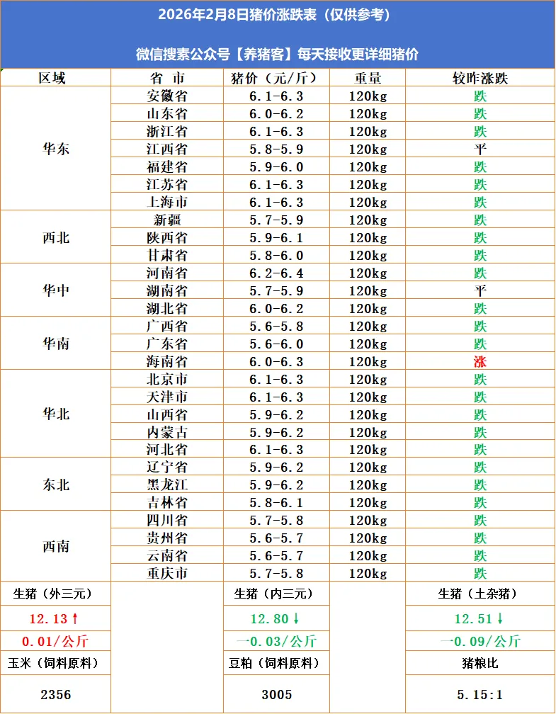 养猪客|2026.2.8|明天猪价分析(只供参考) 养羊网 2026-02-07 养猪客|2026.2.8|明天猪价分析(只供参考) 养羊网 2026-02-07 上一篇:2026.2.8——明日猪价预测 下一篇:这样养羊,产出来的羔子大多是母羔? 您可能还会对下面的文章感兴趣111: 相关文章 近期价格更新!!! 因公用车避雷高德 2026年1月7日全国部分地区鸡蛋价格 2025年4月13日全国各地生猪价格信息